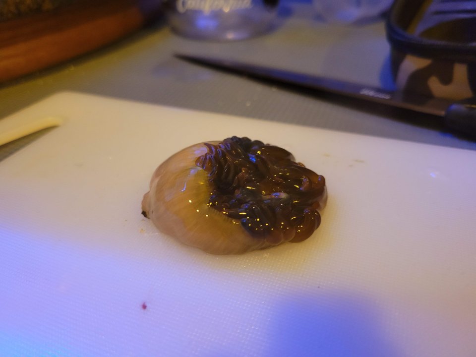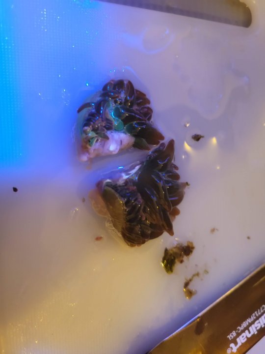 After 5 minutes of fussing around with the tentacles and poking its mouth/butt I was able to get a clear shot and cut though =) The misc debris around the anemone was some algae that was stuck to the foot when I took it out of my tank.