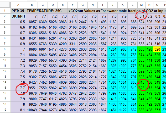 This assumes alk of 7.7/7.8, which I only referenced from the ICP. You go down your matrix and select alk above 8 and assume I get CO2 down to 500 ppm, N/19, which I did for several days the week before, I should get 8.2, which I do not get with this tank.
