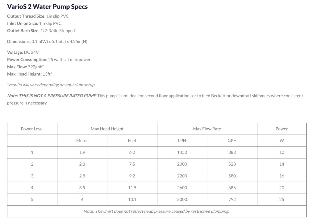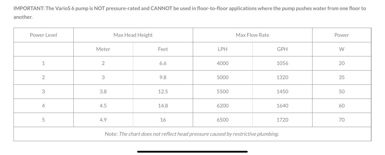 I have had the VarioS 6 on level 2 for the past few weeks, and on level 1 for the past few days. This led to a 1,300 - 1,000 gph theoretical flow, minus the discount on the head pressure/plumbing etc. Below is the chart S6.