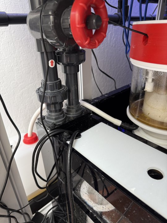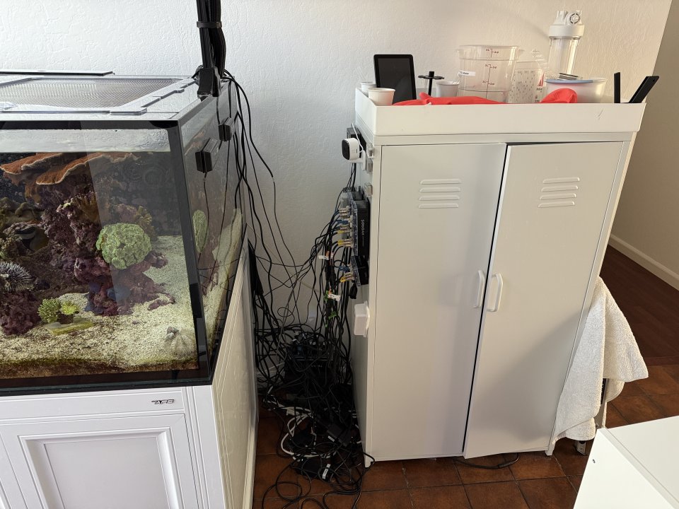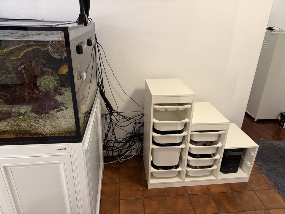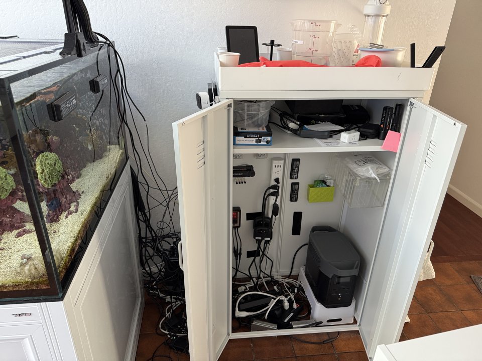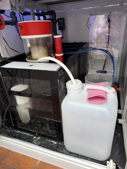 The 5L container overflowed briefly due to an issue with the Hydros collective not returning fully after feeding, including the return pump. The tank was not running through filtration for approximately 1.5 hours. When I remotely (big mistake) reactivated the devices, the skimmer pushed heavily into the container, which resulted in a mess. Unfortunately, my massive cable issue, which I had previously disclosed, was partially impacted by this, but nothing happened.