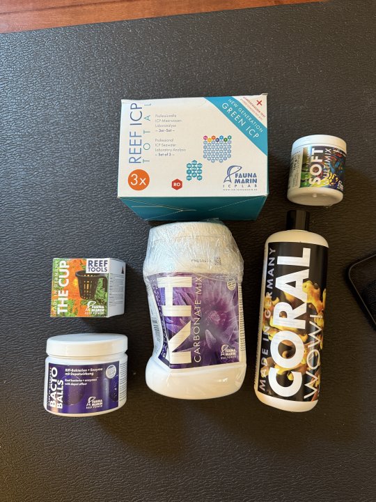 3. Yes, I had to buy Fauna Marin products. Here is a selection of some (not all) of the stuff I bought - you can tell that some were on an airplane. ICP Total tests (6 in total), one of their most sold fish food with different pellet size, two boxes of their alkalinity which has been sold out for months in the US, their new coral wow product, which was not available for sale in the US yet - ammonium carbonate based from what I remember (needs nitrate below 20, and phosphate below 0.2), and their bacto balls + a magnet based cup to put them in - bacterial product which over two weeks releases beneficial bacteria to reduce nutrients (both phosphate + nitrate).