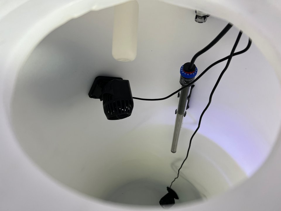 Here's the quick view of the inside: 2 Neptune WAV pumps for mixing, Eheim heater, optical sensor to stop from overflowing