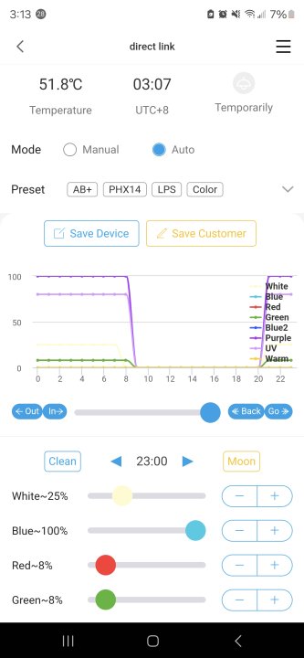 One slightly annoying quirk is you can only adjust the light settings at each hour mark and have to program all hours. So for hours you want the light off you need to go to that time and make all channels 0%.