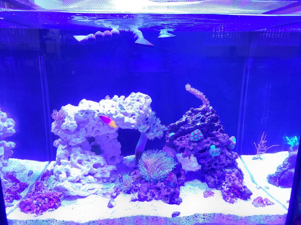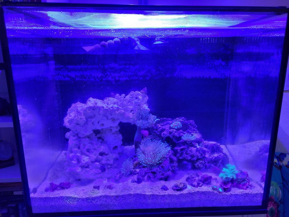 I moved everything over from my smaller tank, but unfortunately I had two losses. I think I must have acclimated them improperly to the new water, plus my firefish had been going downhill since it spent well over a week in the pump chamber before I found it.