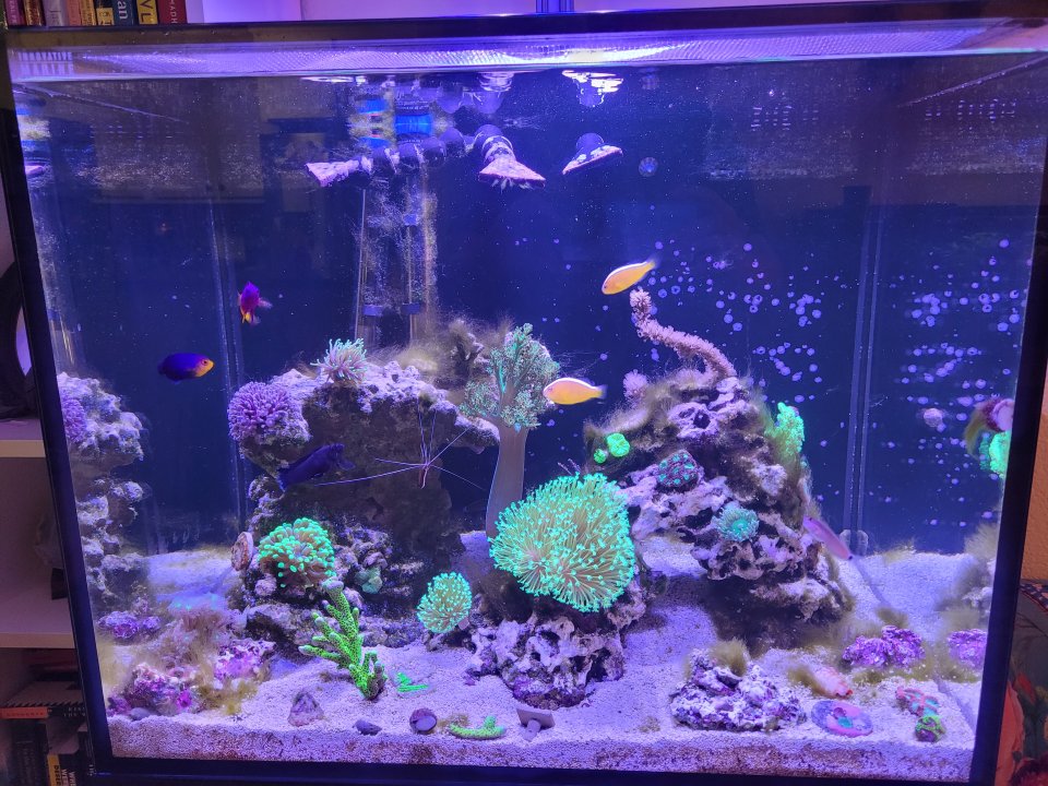 I am having issues with bryopsis and bubble algae (the bryopsis is bothering me way more). I tried two doses of fluconazole, and nothing happened! I have no idea why this didn't work. I'm hoping to get some pitho crabs and lettuce sea slugs this week to combat the algaes more naturally. There are small fish guards over the pump intakes which I think should be enough to protect the slugs. Here's what the tank looks like after a lot of manual removal: