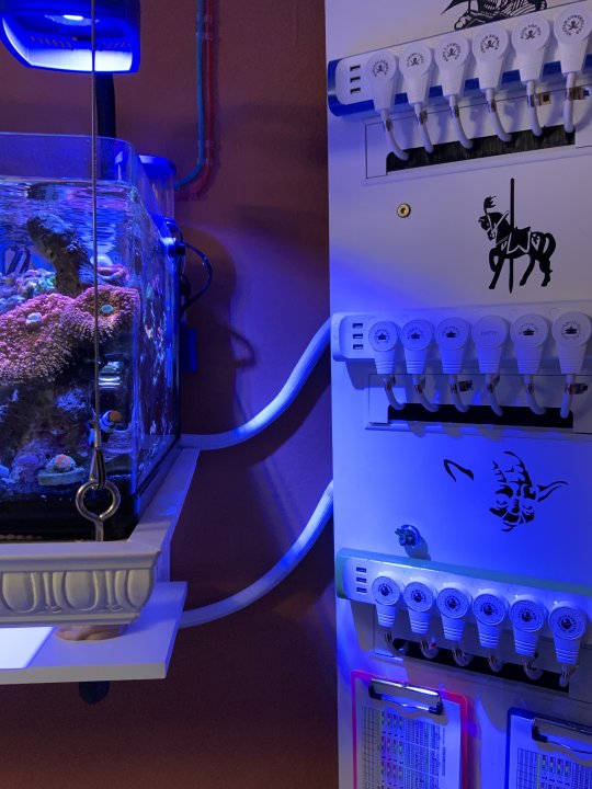 I color coded the power stripes and Ink bird controllers specific to their tanks. Blue ~ Pirates Bay, Pink ~ Fantasyland, Green ~ Dagabah. The white extension cords are 1‘ with a 360 degree flat swivel plug. Each outlet is labeled. Keeps everything uniform in front. All out to tank cords are then ran through a single piece of braided wire loom to make it look like a single cable running to the tank from behind the control board.