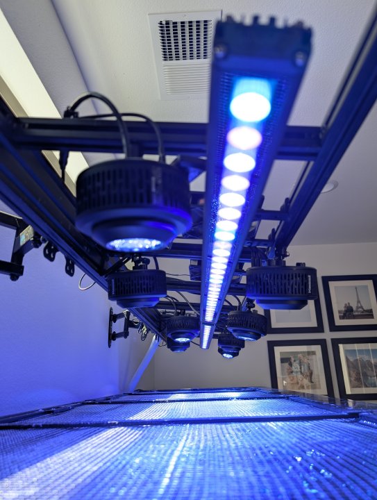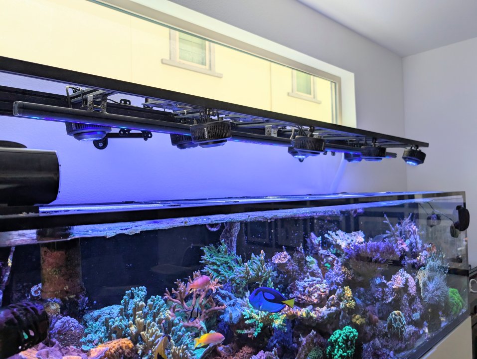 I'm now in the eight Kessil club. Previous configuration was 6 kessils down the center area and two rows of four Quanta Pro strips in the front and back. I wasn't 100% happy because the LED strips washed out some of the shimmer and I had to compensate the blue color by cranking the Kessils to 100% white. All personal preference, corals loved it. I now have two Quanta strips down the middle and eight Kessils on the front and back. I'm much happier with the color rendering, spread, and shimmer. Huge visual difference was with the Kessils in front angled inwards that reduced the shadows when viewing from the front of the tank.