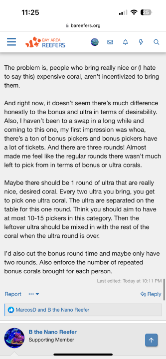 I agree that the ultra list can be refined. But I like the idea of an ultra round because it lets those people who brought really nice corals get first pick. With the current system, someone who bring a designer torch is picking with people who brought ie 3 bonus zoas or 3 gold/splatter hammers all which can be purchased fairly cheap. I know if there was an ultra round, more people would bring ultras so you’re actually swapping 1:1 ultra for ultra. Kinda like the holiday swap. We’d still have the bonus rounds after with the 3 bonus=1 ticket so there’s still be bonus corals making it to the normal rounds.An "ultra round" might definitely help this issue, and I think it's a great idea that can be implemented - but I also think that many of the current "ultra" corals should not be considered ultra at all. One goal of the bonus system (3 frags to a ticket) is to ensure that a significant number of desirable corals make it to regular rounds so everyone has a chance. An "Ultra" coral is one that is so special that we collectively decide it should be exempt from this, giving it a a 1:1 "value" with the intention that someone will be incentivized to share it at all. By including too many "ehh sure" corals on the Ultra list, we dilute the incentive to bring those truly special corals.