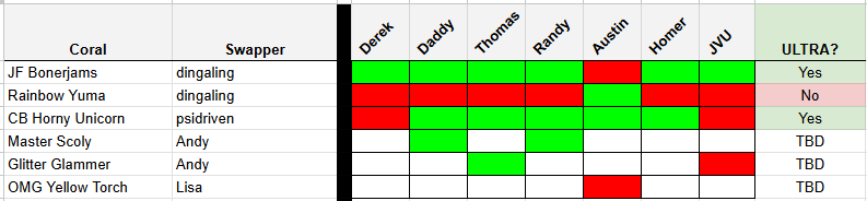 What if we did something like this. SOMEONE has to decide, since things can't be totally democratic, but the idea here is we identify a "committee" to align on which corals are Ultra. BAR members submit their petitions to a google sheet (I would be happy to maintain this, could perhaps hire @dangalang to build it). The committee then simply signs off on each item and if it gets enough votes it gets an ultra designation, if not it doesn't. The "committee" could be sized such to make everyone comfortable in terms of transparency and representation.