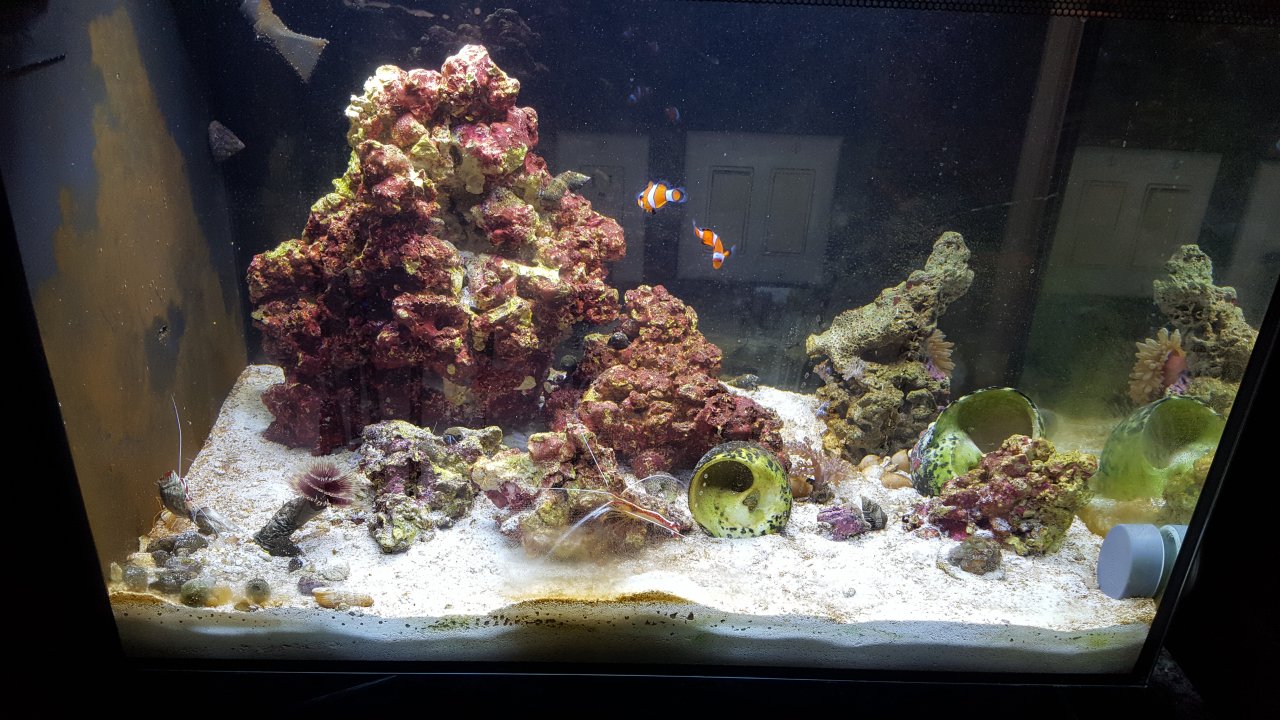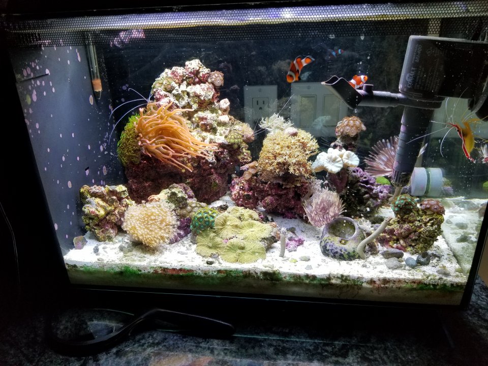 This was the tank in June 2018, The coral has changed a bunch since then, but the tank is pretty much the same concept. 3 gallon water change every 3 weeks, start frags and see what survives. We don't try anything super tough in here so we have had good success. Grew a Duncan colony to the size of both my fists together took it out when it was doing poorly due to the pump being choked from detritus in the sponge. Took that out, now growing a big frogspawn. Just lost the little clownfish last week though, likely from bullying. I am trying to convince her to turn the other one loose in the FV tank and get two new fish. I could let her do a tank journal if she wants to come online, but I bet she will just have me post pictures for her.