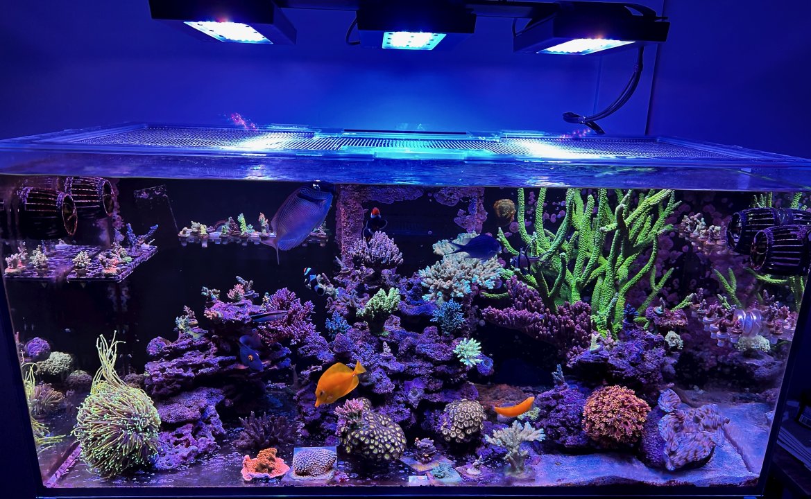 I haven't down top down photos in a while so I don't have a recent picture, but I'll try to snap one in the next week or two. I have a PAR meter so I know the maxima is getting around 300-350 PAR. Not as fast of a grower as the derasa though.Congrats on the upcoming baby! Got any close up photos of that smaller clam? Curious how much PAR it's getting. That green slimer is nuts too, so much growth! Looks like it's growing out of the tank already.