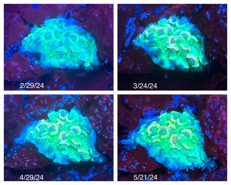 Had a little rough ride and seemed to continue on the trend that @CaseyP was seeing with receding flesh for the good part of 6-7 months, but as of late, I have a little hope. After a in-tank treatment of cipro and erythromycin for a bacterial issue I was seeing affect most of the coral in the tank, it looks to be coloring up and finally growing some new tissue.