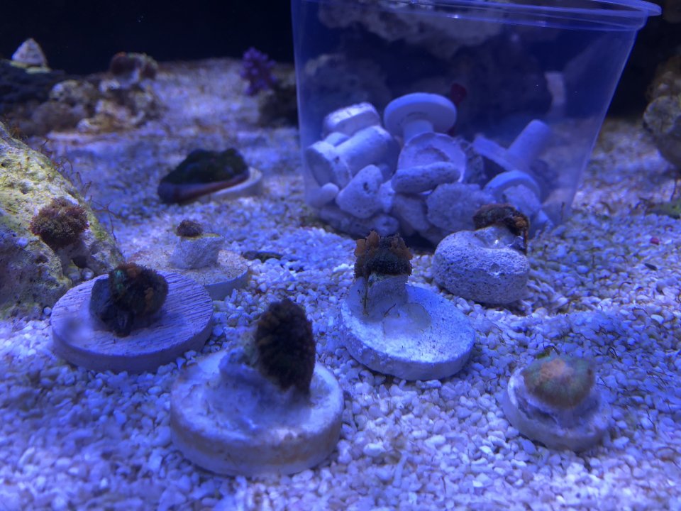 Got 5 ready to go (the one front right is a little bleached do to being shaded in the old tank. Not included in the 5, will let it get back to health before passing it on). Additionally I have another 5 I just fragged off the rock, if they look good by next week I will include them as well, or whenever they are ready. 2 frags are set aside for @NanoCrazed since he hadn’t got the one he was supposed to, and one to @Corallus since it will be convenient to pass one on when I pick up a frag from him today, and since he has been part of several dbtcs including mushroom ones. So right now 3 are ready and available and hopefully 5 more by the time to choose.