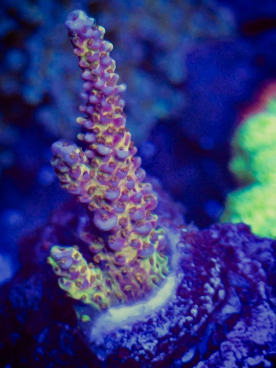 I actually really like the green mixed with it. I hope it keeps some of it. But it does appear to mature out into the maroon and pinks as it settles in. I've been struggling with the dinos off and on, nutrients, and a big alk drop swing in the recent path. I'm hopeful that they got through it ok and won't randomly regress to being unhappy. Lol