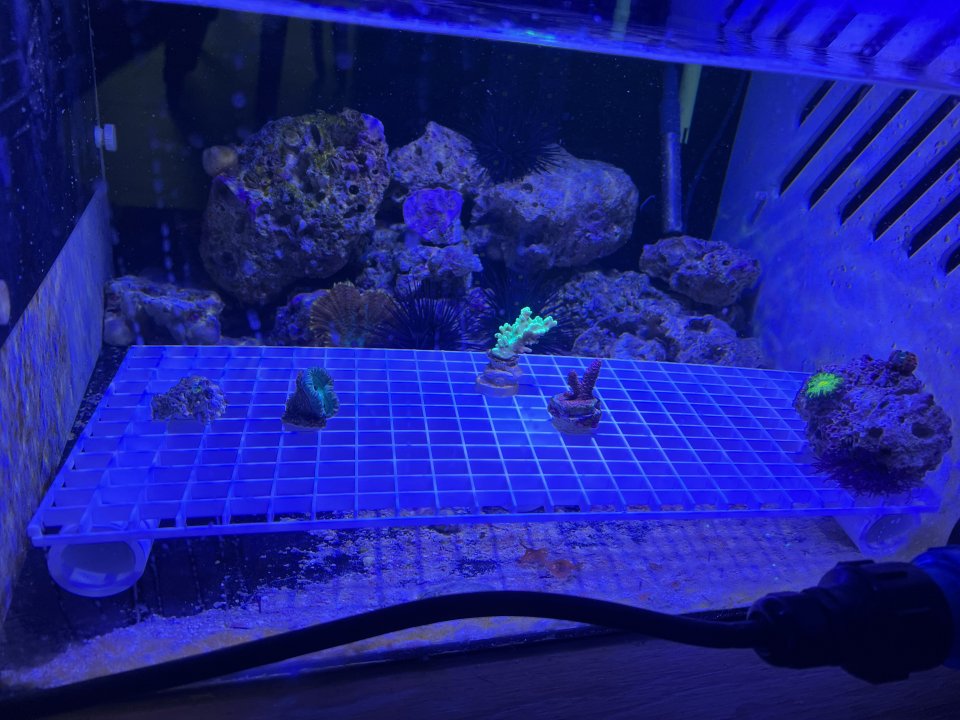 Finally decided to turn my fuge into a frag holding area and hung a Reefi Uno 2.0 down there, and made a little frag rack out of egg crate: