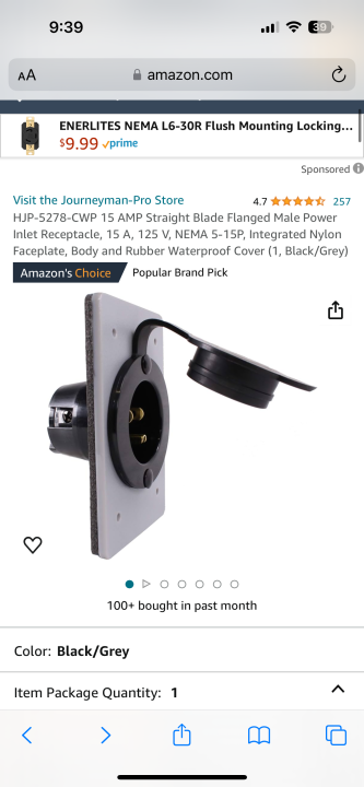 HJP-5278-CWP 15 AMP Straight Blade Flanged Male Power Inlet Receptacle, 15 A, 125 V, NEMA 5-15P, Integrated Nylon Faceplate, Body and Rubber Waterproof Cover (1, Black/Grey)