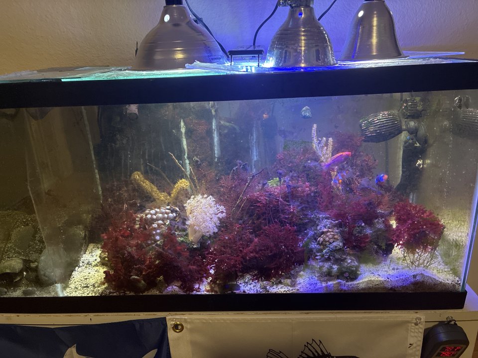 Lot has happened: turned 10G sump into a blackwater tank (with mainly tropical houseplants and Pygmy Corys) and first replaced it with a hacky one made from some cheap plastic tubs, had a leak scare while I was on a work trip from air buildup in my overflow, stripped it down to a sump-less setup running just a nano skimmer, had a pretty bad dino outbreak and couldn’t get my nutrients up once the (dimly lit) sump and its sludge/microfauna were removed despite feeding stupid amounts, got fed up, and then finally built myself an all-in one out of a 40 breeder with a refugium. Not sure how much was needed but liking how the upgrade went. Poor little ruby dragonet died when the dinos (osteo) had been out of control, I’m guessing she was the most susceptible after eating Dino-rich pods all day but that’s just a theory. I just like having a refuge region so I can stare at the baby microfauna anyway.