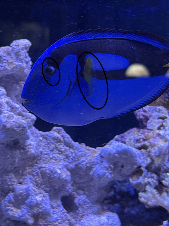 1. Fish would have stopped eating by now (its 2nd time in 7 days for PBT and a few spots on Hippo tang for same duration).
