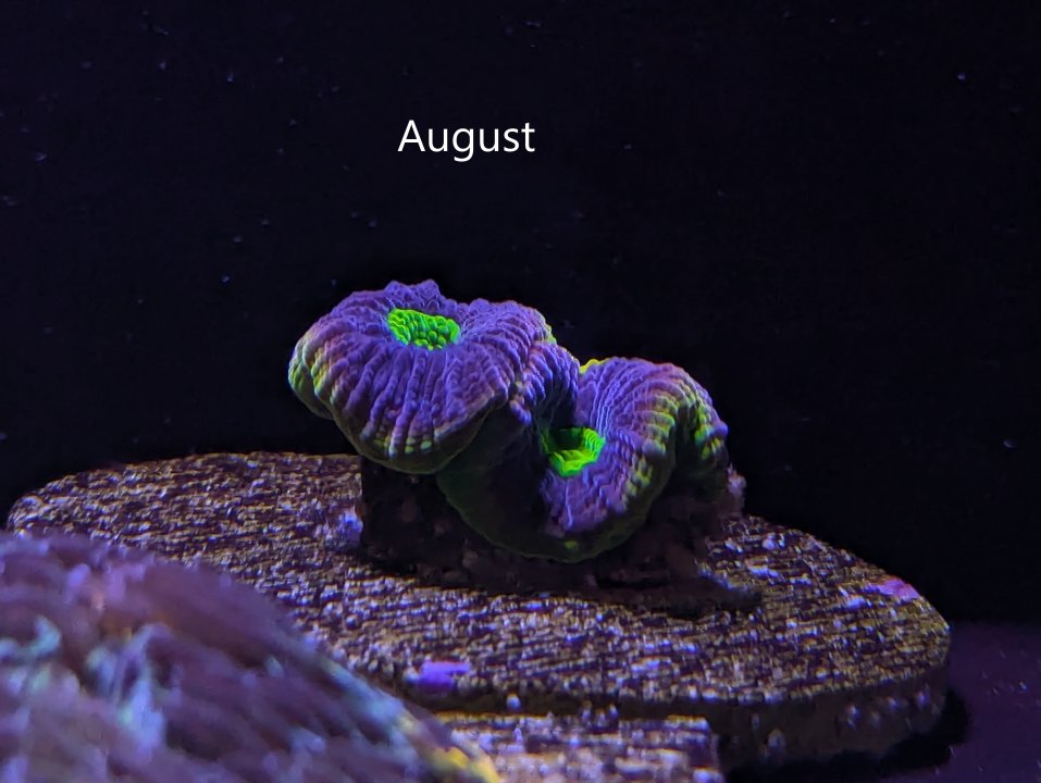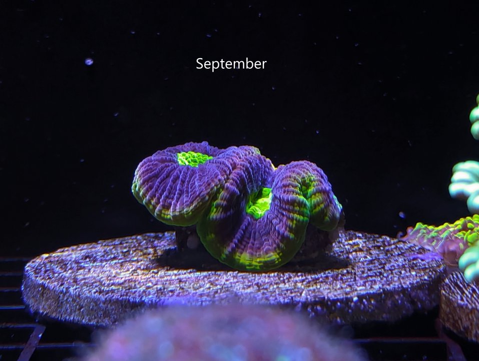 Still alive and milestone achieved - flesh on one of the polyps is now touching the base of the frag plug: