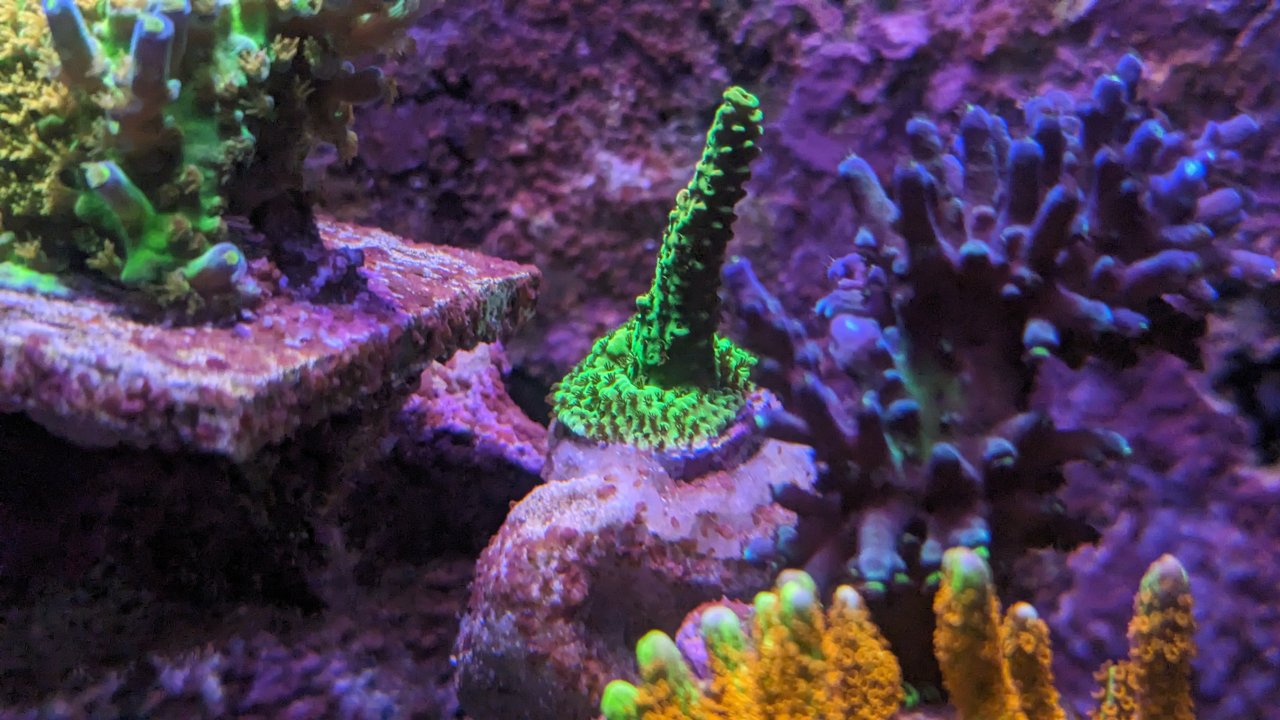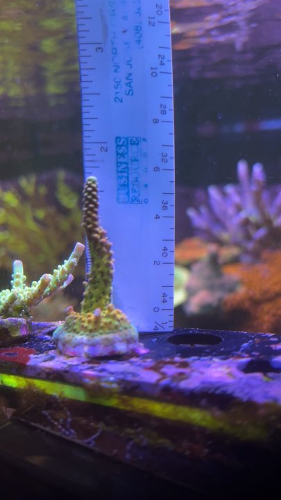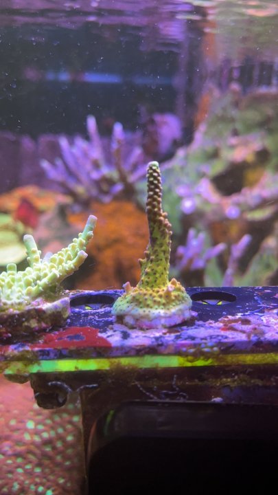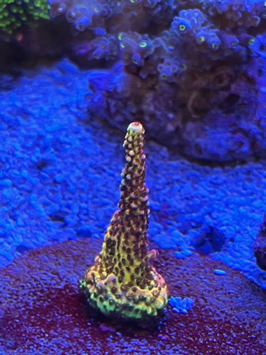 Latest image of mine, unfortunately it browned out on me again 2 months ago, and developed red cyano On the tip and I lost the part that started to encrust. At the time I swapped wavemakers and my alk fell to 5. I got the numbers back up again a few weeks ago. I clipped the dead tip last night off in hopes given time and more stability it will return to health.