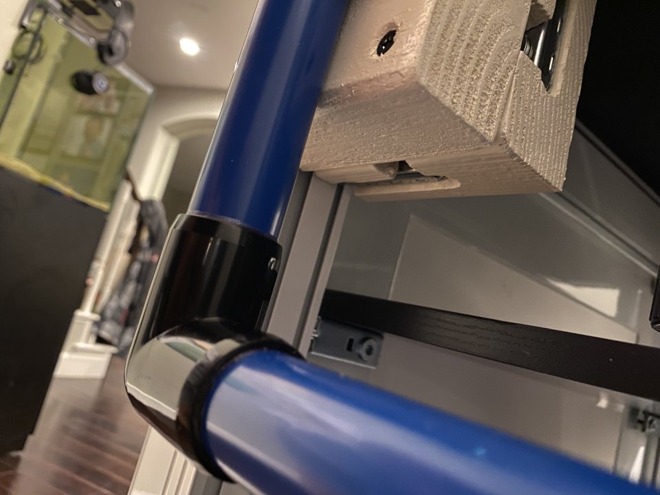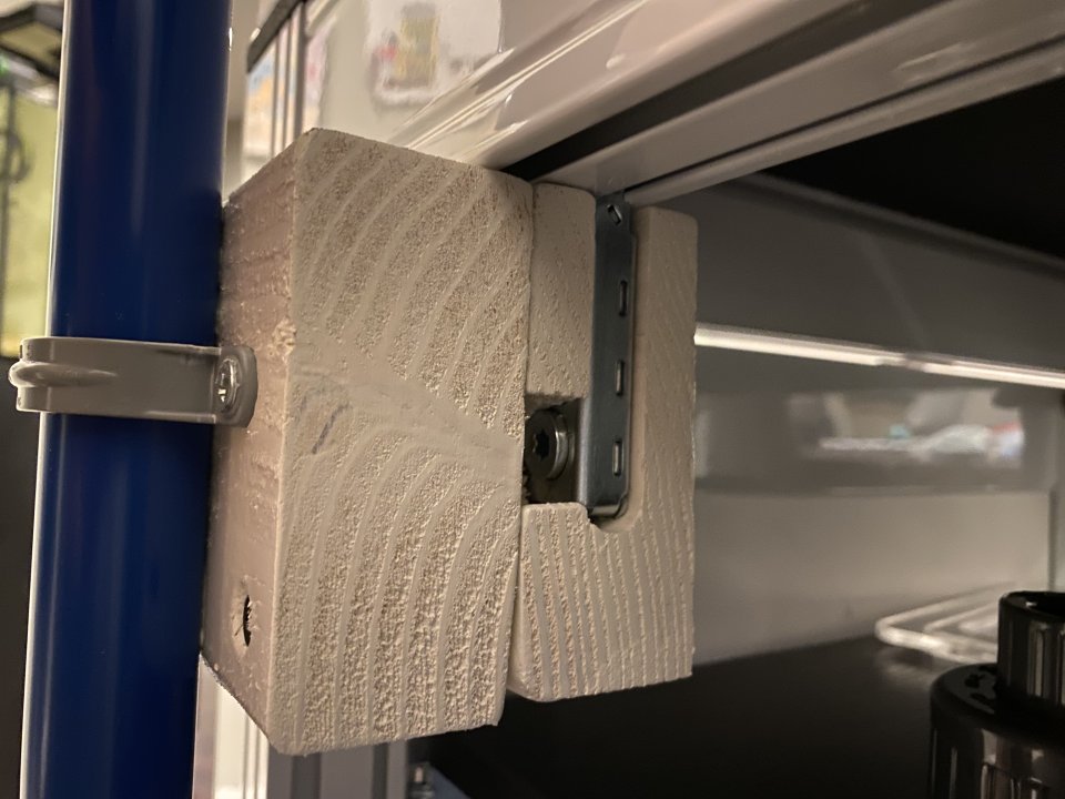 I supported a couple wood blocks with the tension cams that IM sells for supporting shelves and routing out some 2x4 blocks to fit the tension cam in to hold the block in place. I’m sure you could have accomplished something similar with t-bolts and nuts, but I used the cams because I had some on hand.