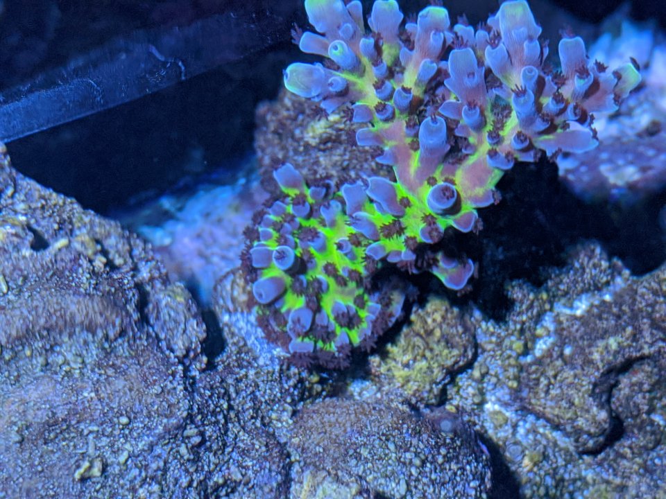 Dinos still appear to be gone, which I will never take for granted again. Picked up a frag of @ofzakaria 's Shawn Bennett BC Yellow Tort, which is now sitting front/top and center in the tank: