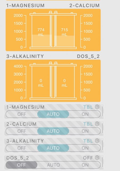 I dose my Triton 3-part with 2 DOS pumps and 1 DDR. I use the DDR for parts 1 & 2 of my Triton Core7, and a larger DIY dosing jug for part 3 (which doses as much as the other 2 combined). I like the graphic tiles that show at a glance how much is left in each of the DDR containers, but it has always annoyed me that it won’t show how much is left in my non-Neptune container, even though I’m using DOS pumps for it, and even though you can enter the volume of the container, the Apex updates the volume as solution is used, and all other relevant details to be able to show it are there. Like Neptune saying “No pretty graphic for you unless you buy our DDR”.