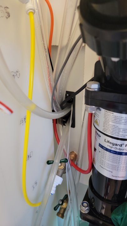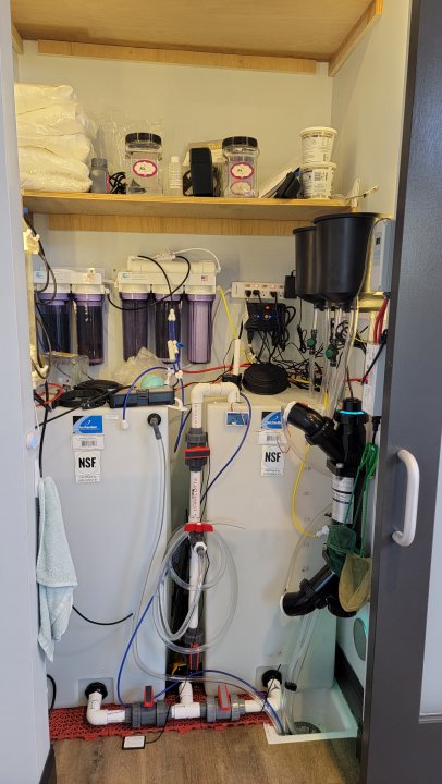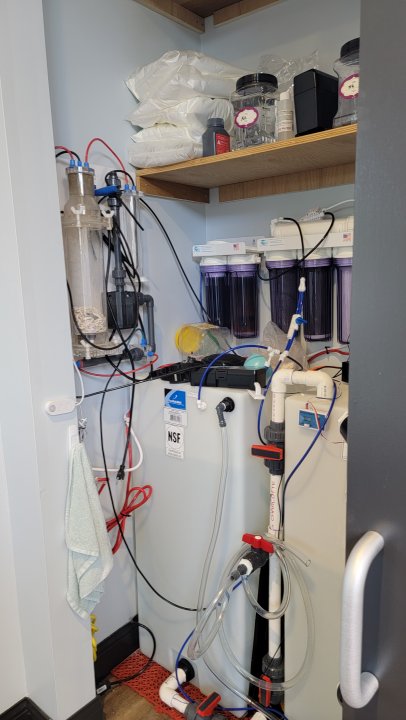 Here is my setup. Its a bit crazy and I still need to get the calcium reactor running. I have a couple of hose bibs in the closet and a floor sink to drain everything.