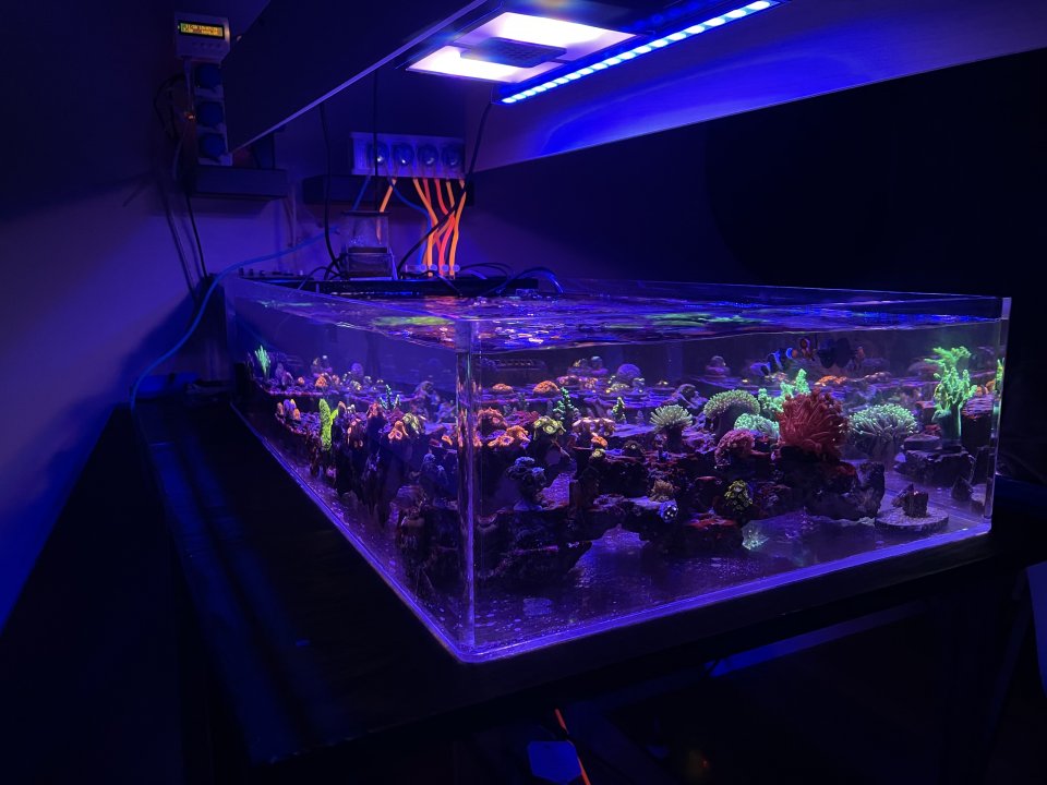 I hate DST, but the darkness does help with picture taking. I turned off all my lights besides the tank and took these shots which showcase the unique dimensions of this shallow tank