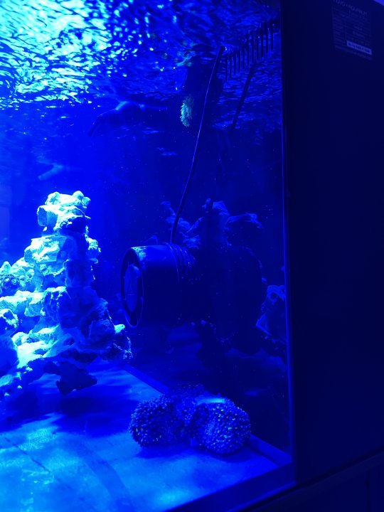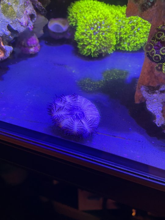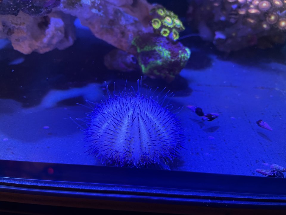 I added two urchins. I’m hoping they will eat the coralline. One came in pretty beat up with missing spines but I’m hoping it can recover. There were not spines in the bag so it lost them before shipping
