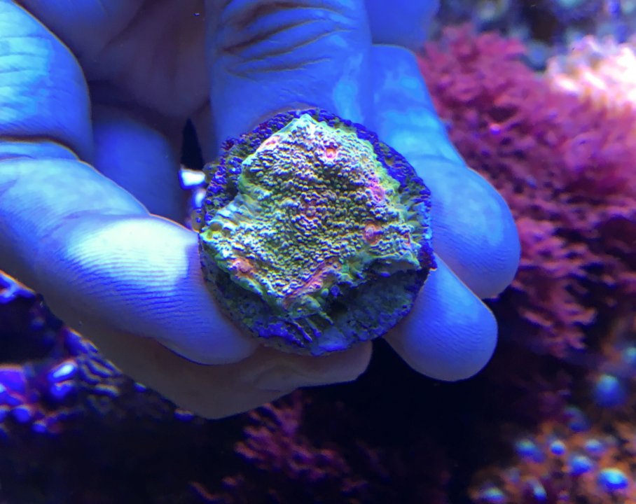 Getting lazy and just used my iPhone for pictures, but thought I'd post an update. It's on a raised rock so it had to grow underneath itself a little to finally get to the rock to be able to encrust so growth has been a little slow, but it's still looking good.