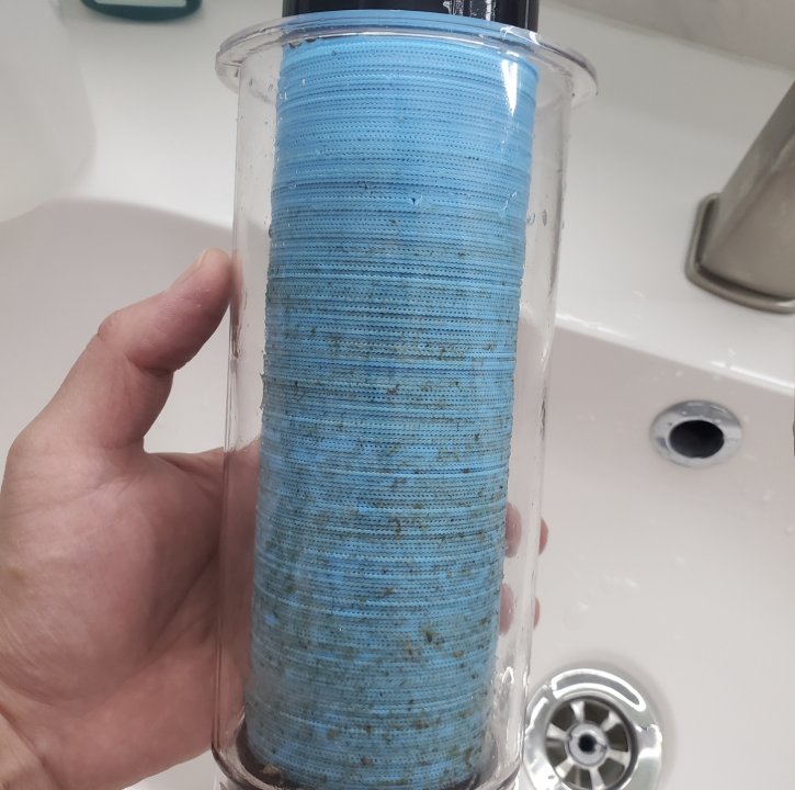 Washing them out was fairly simple but tedious. Loads of uneaten food, algae, and other detritus all spilled out as I flipped through the disk while rinsing, but that's the pain point. Having to flip through all of the disk to dislodge detritus takes a while. Cleaning these out took 3 times as long as flipping a couple socks inside out and rinsing all the loose crap away.