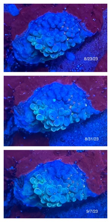 If someone asked me what the hardiest corals were and what could survive about anything, it’d be these three. I’ve had these since they were little frags for probably 4-5 years, but they have been through quite a bit and they keep on ticking. Even when I have to frag a piece because of an issue, they’ve been able to regrow from start and manage to survive. They’re dealing with my current issue only with a little damage, but with a ton of water changes and cipro, they’ve been super troopers.
