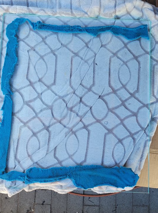 Got the panels taped up and ready for clamps and silicone. To ensure the tapes are straight, I used 2 erasers blocks as guides.