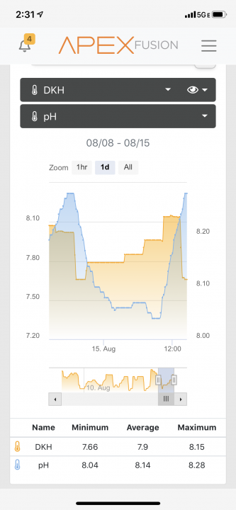 Out of curiosity, can you post a graph of dkh and ph? Right before lights dim is also likely when the PH is highest...