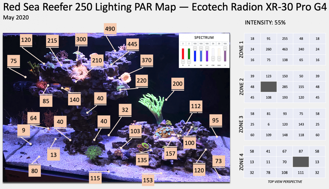 I made seven maps at different light intensities, from 50% to 80%, at 5% increments. I'll credit COVID-19's extra tank time and boredom for the inspiration. Here's the 55% mapping which I have been running my light: