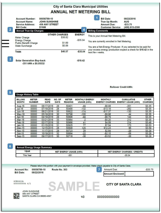 Here is an example yearly bill on SVP website. I hope i'm reading this correctly. Your usage and production get sum up at the end of the year, and yes, if you produce more than you use, you get pennies. This is fine with me. The description says you don;t pay monthly, but annually.