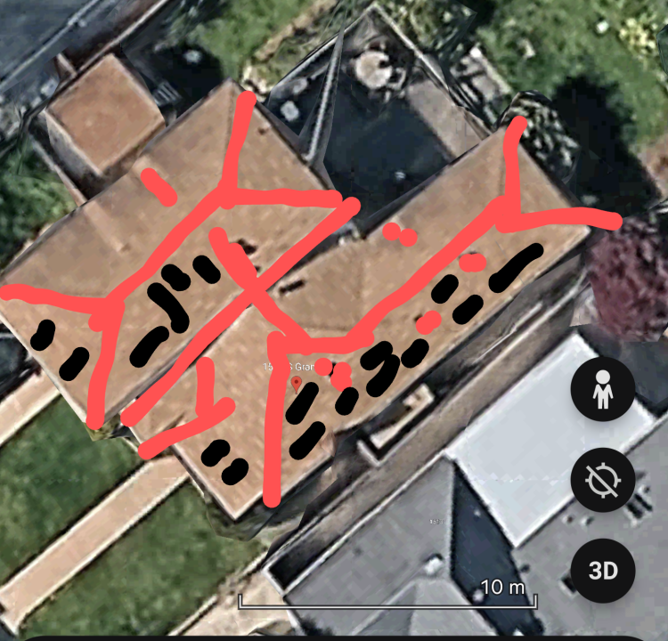 My guess is you could get 18 panels where I have them on here, probably more, despite all the angle changes and complexity of the roof. Red are ridges and vents.