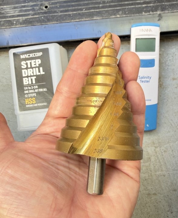 To drill the tank, I picked up a step drill bit on Amazon that covers 1/4" to 2-3/8" holes, since I needed to drill a 1-3/4" hole for 1" bulkheads. The drill bit is HUGE!