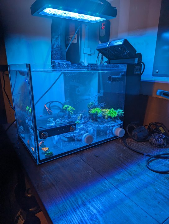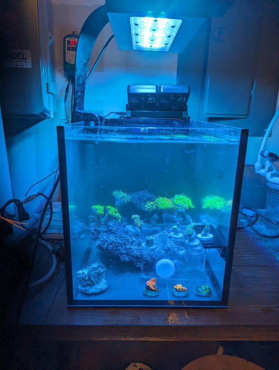 I've been running the big holding tank in my garage fallow for the last few months, with the aim of having pest-free coral to transfer into the display tank. Anticipating the frag swap today and the coral farmers' market coming up in a couple weeks, I started up a small IM Nuvo 14 peninsula tank (thanks @Srt4eric!) to act as a coral and invert QT tank going forward. I'll be following Humble Fish's guide to coral/invert QT, and will slowly raise the tank temp to 80.6 F to shorten the fallow period to 45 days; and the nice part is that adding new coral to this system doesn't reset the timer on the fallow period for the other corals.