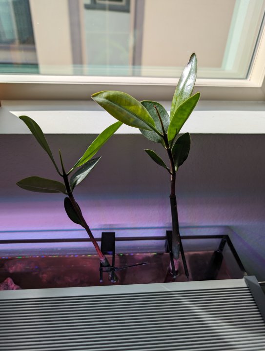 Macroalgae: after a long hair algae infested ugly phase that smothered a lot of the rock and macroalgae, most of it has stopped growing back as rapidly. I had seeded the tank with a couple bio balls from the reef tank but thinking about it more, I probably should have transferred over a lot more live rock to speed up the maturity. Unfortunately a lot of the macroalgae has melted but I'm hoping the remaining bits grow back. ICP tests came back positive on all the essential elements for plants like iron. Funny one was phosphate that came back very low. I had always assumed I was high on nitrates and phosphates because of the wild hair algae growth. Mangroves are growing albeit slowly. A couple new layers of leaves sprouted up as the days got warmer.