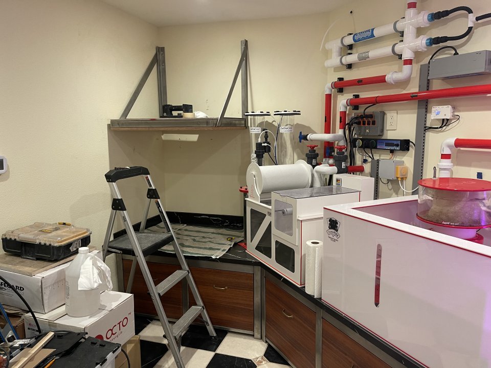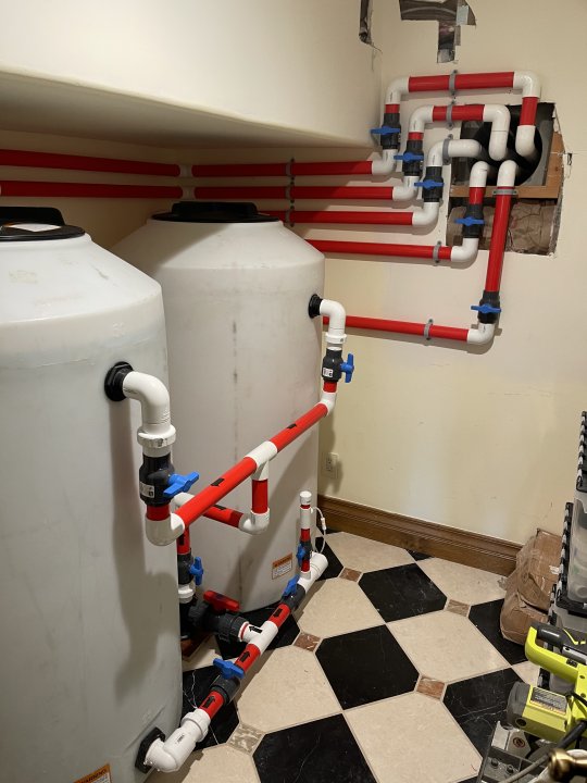 BTW…just finished stubbing out the remaining piping in the water change station room for another future tank! Also, the low pressure ATO reservoir tank is now activated in the system along with a high pressure system.