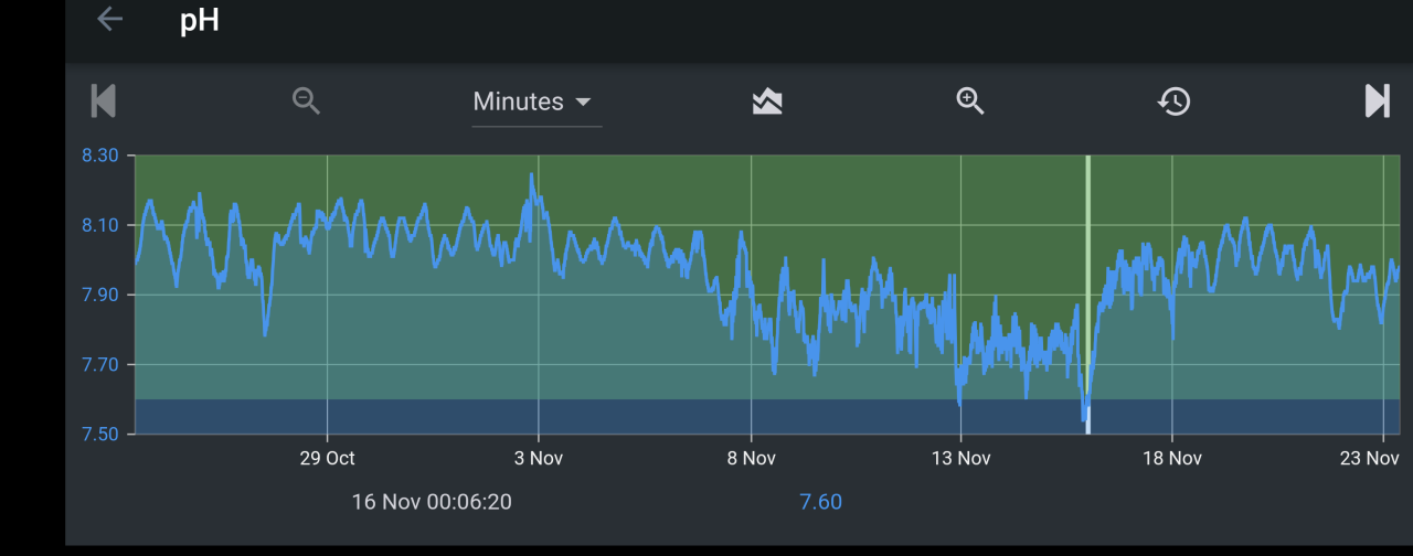 Vertical line denotes when the bottle was switched out. I also noticed this time of year, the pH drops earlier than before, so I pushed up my fuge light and kalk pump turning on an hour sooner.