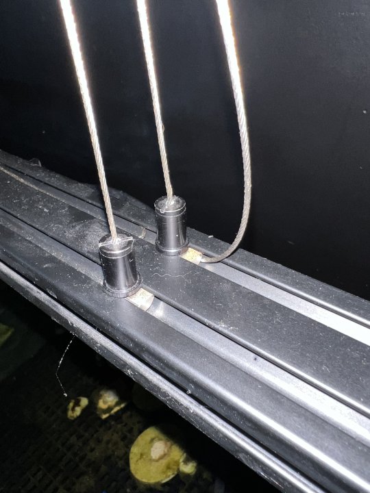 Need to still adjust everything and mount the ballasts, but luckily we hit a beam up top to really anchor the hanging brackets. Used a Neptune Sky mounting bracket that @robert4025 had in stock and modified it to fit the Tnutz loops on the top of the 2040 rail. View attachment 65967