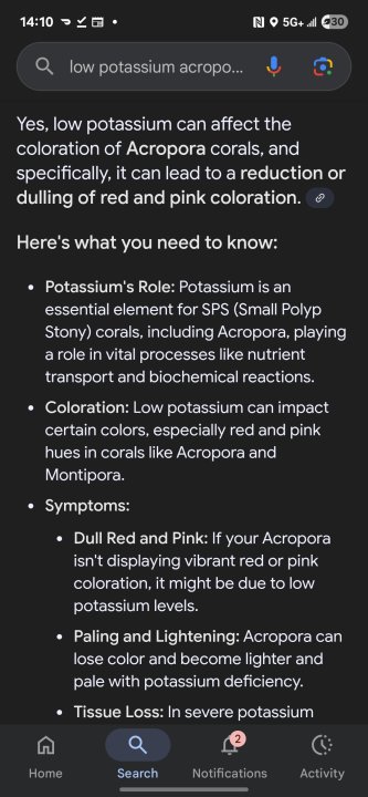 So seeing that post in picture above I ordered a salifert potassium test. The test displayed 280 potassium i believe it should be 400-408 acorrding to test kit and online.