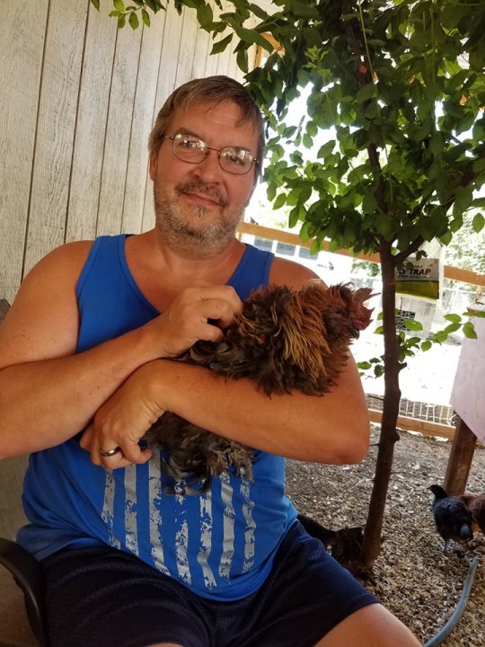 About 40 chickens but one is my pet. He is a Silky(Frizzle) named Rooty Tooty for obvious reasons(Rooster).