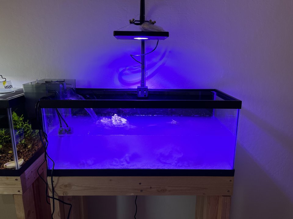 I'm lucky enough that I was gifted a light: the Hydor Aqamai LRs50. It's a 50w LED light, almost AI style with the little compact circle of LEDs. I also tossed some media into my LFS's sump a couple weeks beforehand, and was allowed to collect cycled media on tank startup.