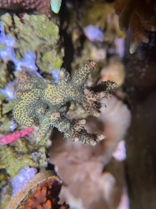 Despite all the rainbowy new hype corals, one of my favorite acros is still the classic ORA Hawkins 'Echinata'. It's got really nice color in whiter light, when the tips begin glowing blue-purple. My light schedule has an hour of really white light just for this one coral.