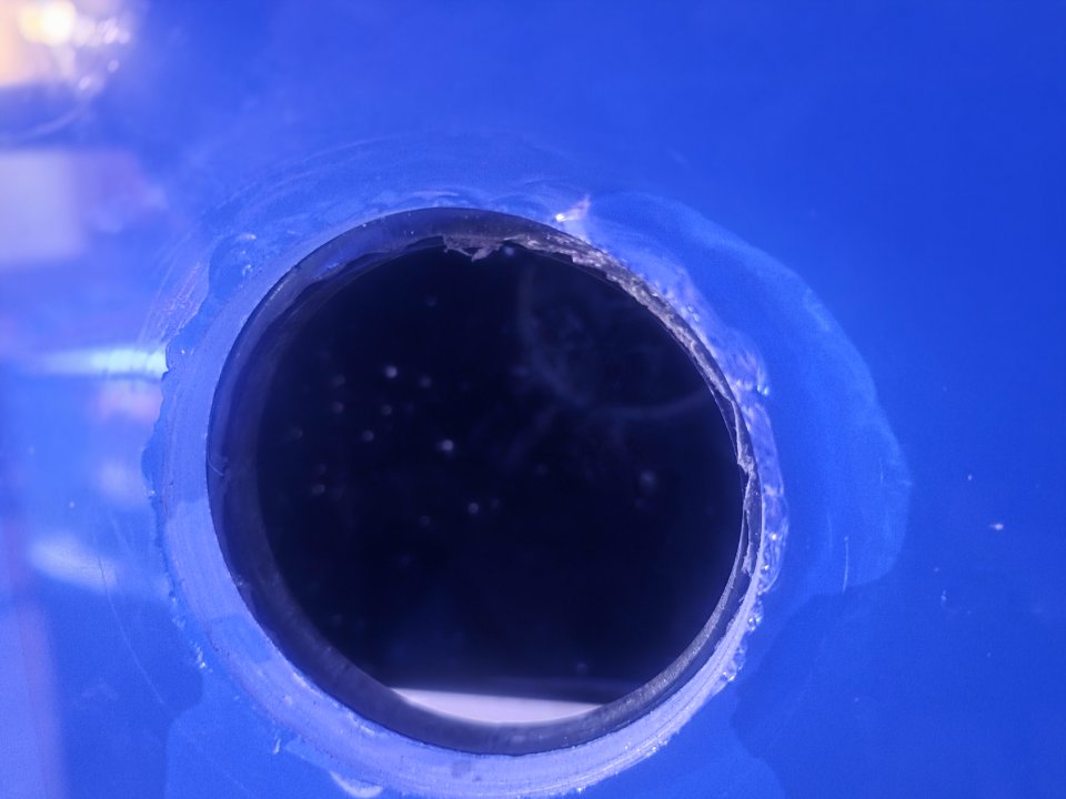 I usually drill outside to in, but I make sure to clamp a piece of wood on the inside of the tank to ensure I don't push through with too much pressure at the end. Also, on smaller tanks, it's hard to go inside to out because my drill doesn't fit.