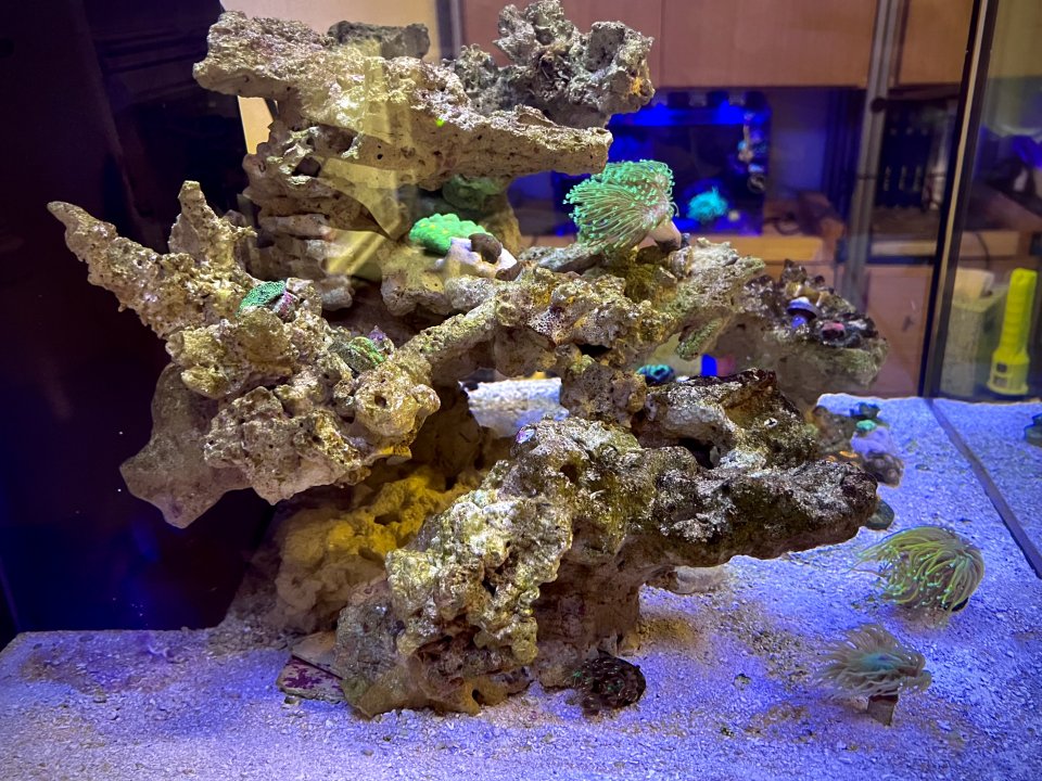 Few tank shots after moving some frags over. Left light in it’s weird color so excuse the weird tint. Rocks are still very rock colored :-( Added 2 encrusting months, 3 Acans, Clove Polyp, Duncan, Chalice, 6 zoos and a struggling Goni. Nothing is in its final resting place, just in there acclimating.
